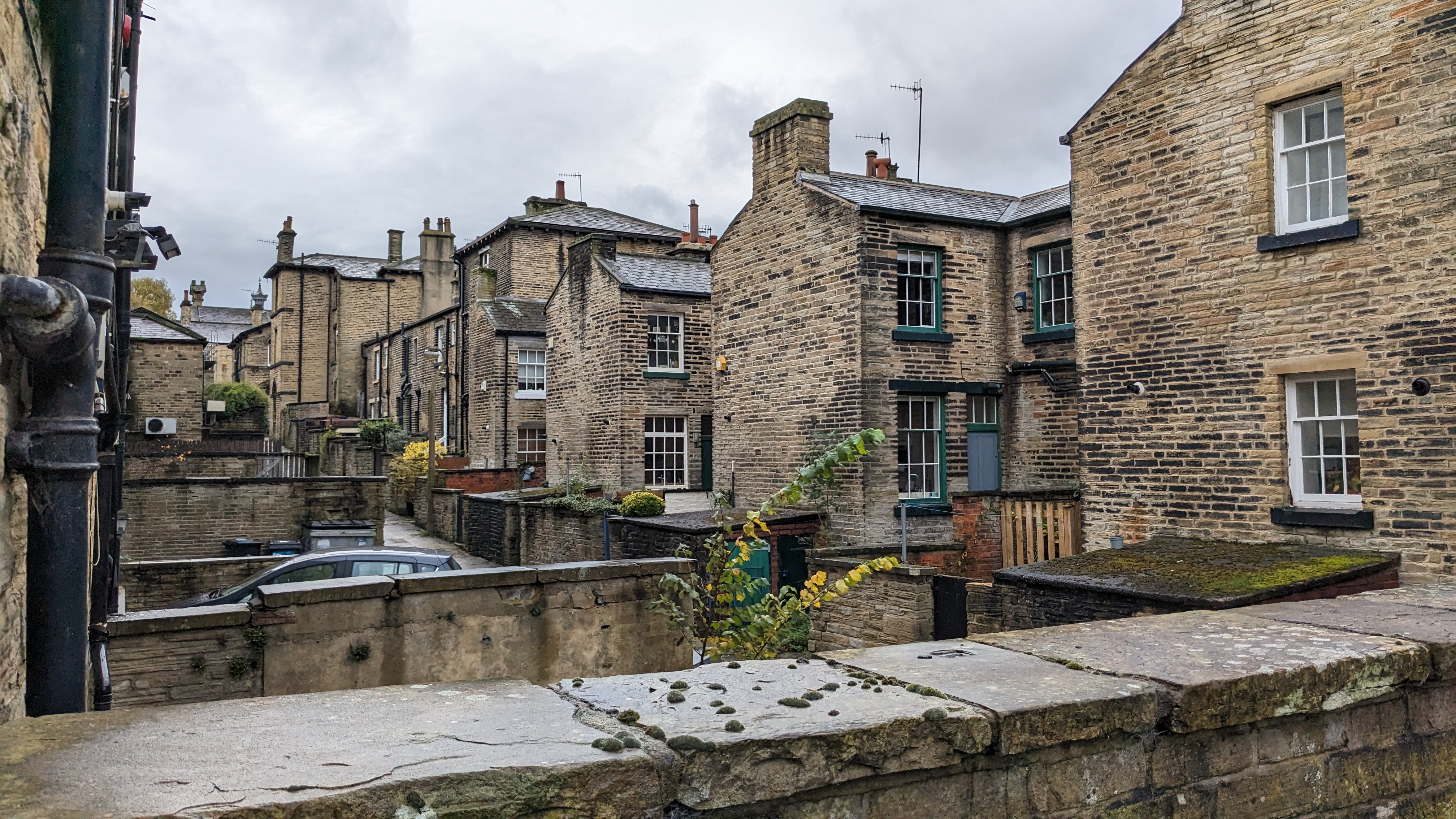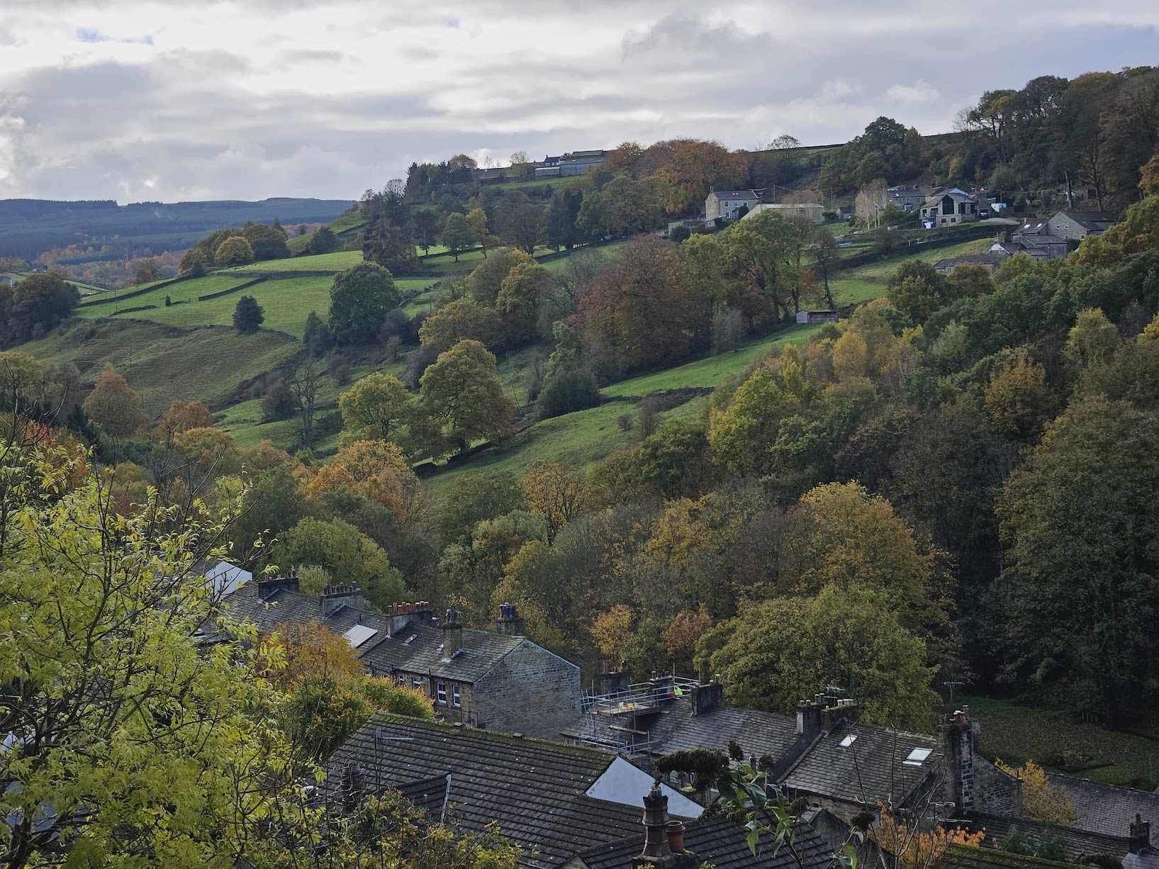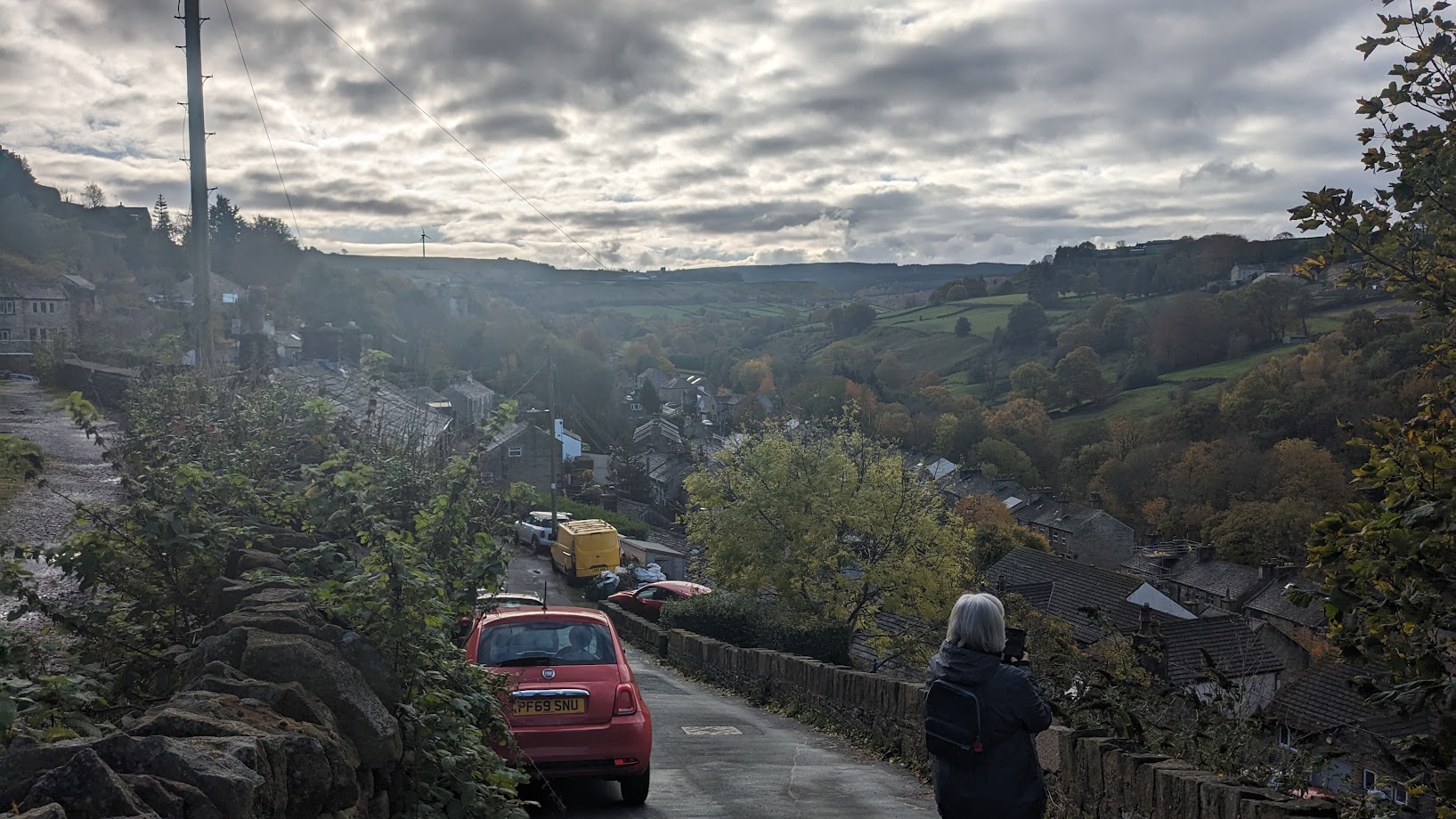 The walk down into Holmfirth was wonderful, along the side of one the steep valleys, in among the old, now blackened, Yorkshire Sandstone cottage. The autumnal views on clear and crisp morning were lovely. It was pleasing to note that some new builds on top of the hill were constructed with the same stone, and the same stone window casements as the much older cottages that surround them.