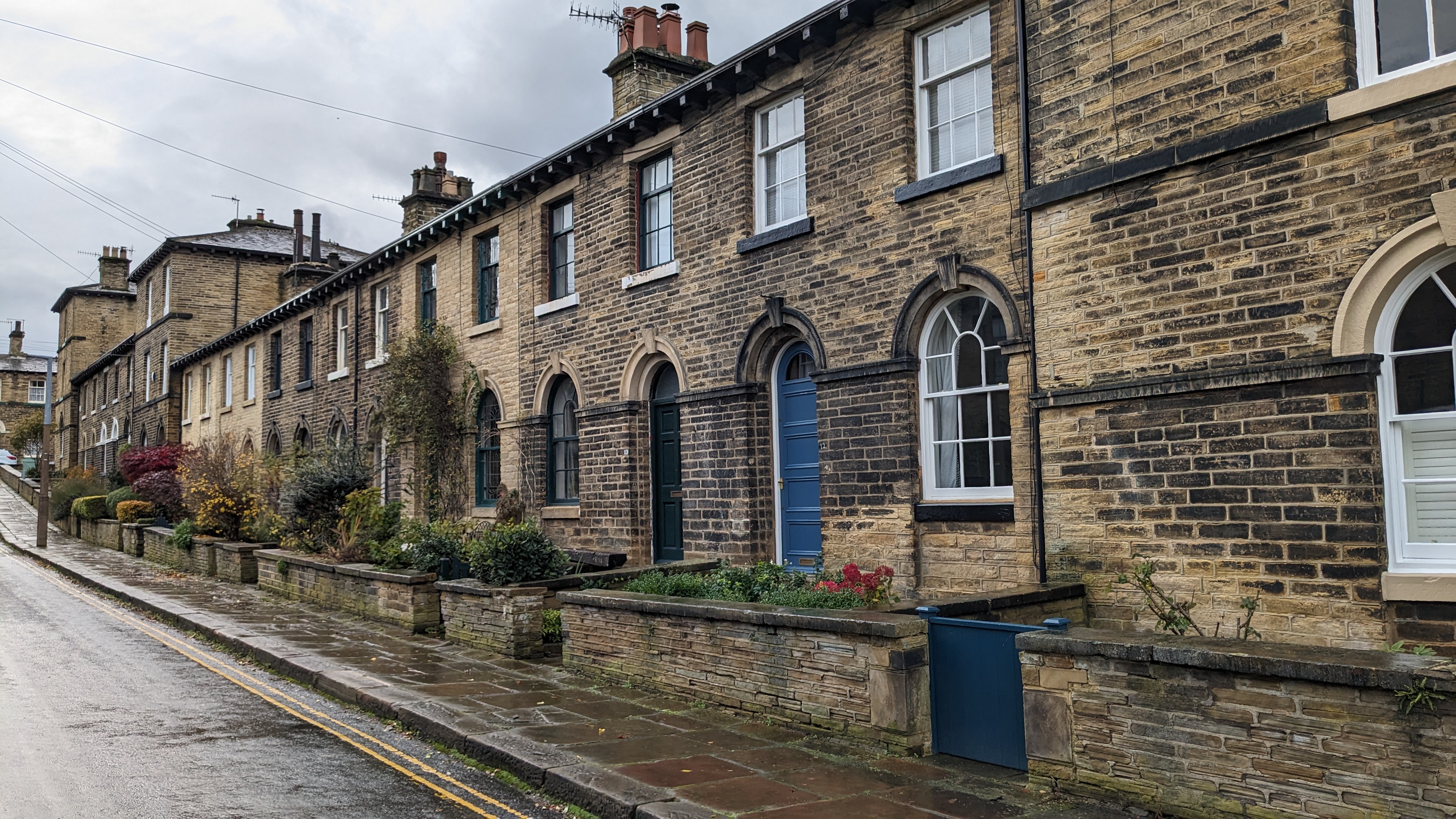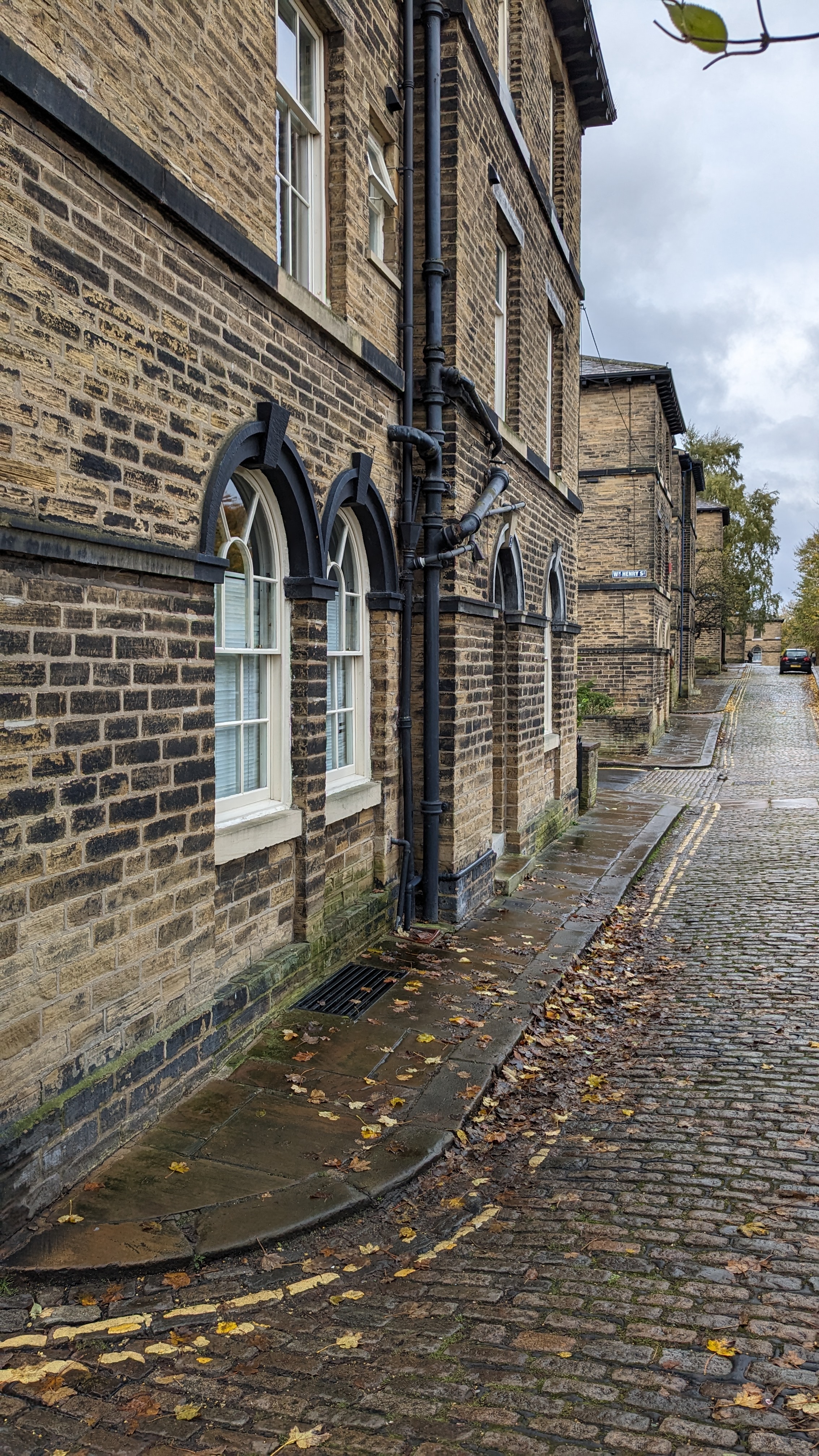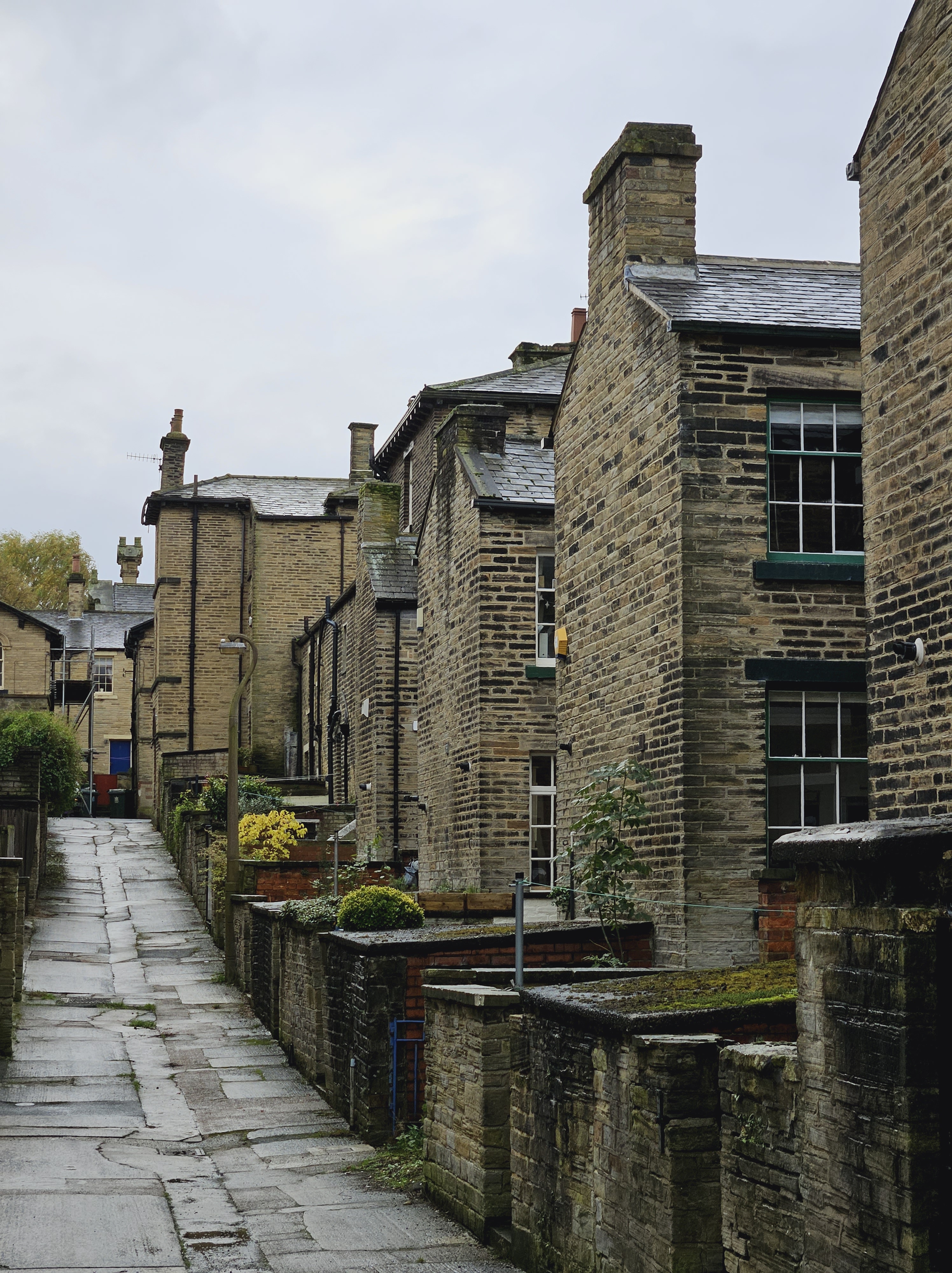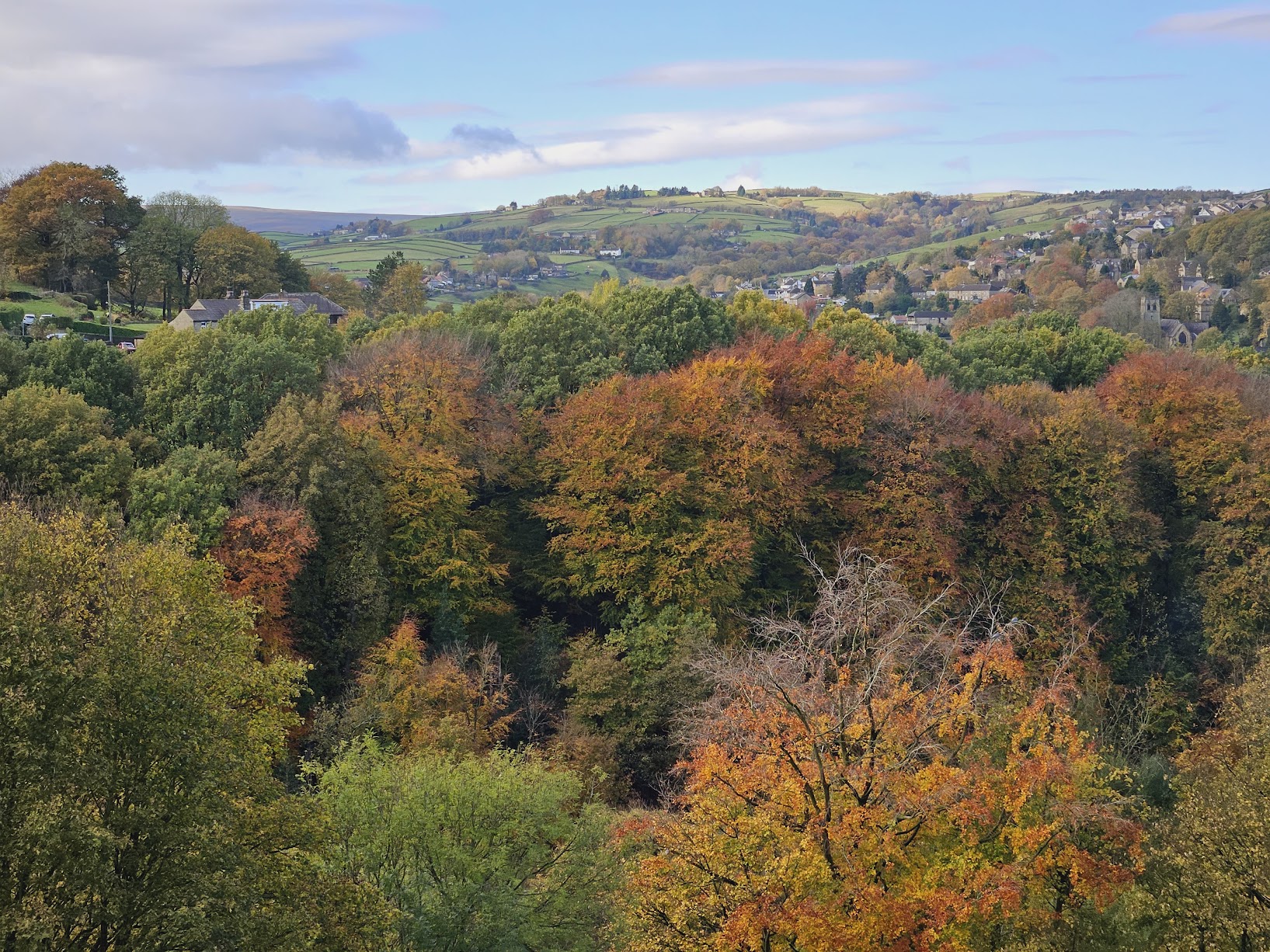 The walk down into Holmfirth was wonderful, along the side of one the steep valleys, in among the old, now blackened, Yorkshire Sandstone cottage. The autumnal views on clear and crisp morning were lovely. It was pleasing to note that some new builds on top of the hill were constructed with the same stone, and the same stone window casements as the much older cottages that surround them.