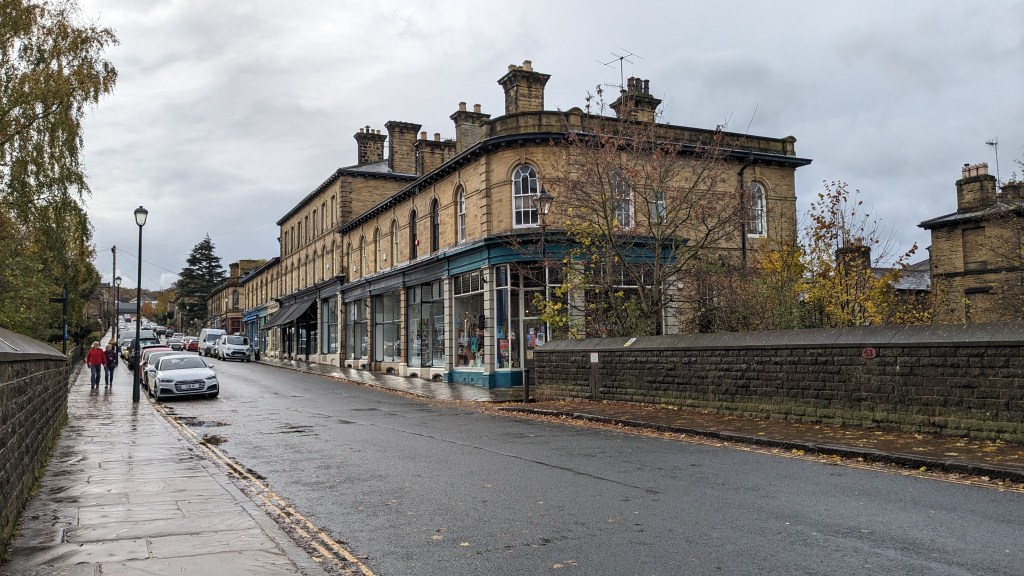 The town itself was pretty, all old buildings, and all in the blackened sandstone that the houses on the hill were made of. The River Holme was moving a quite a lick, unnaturally narrowed I think to help with the mills that used its water in the nineteenth century. Oddly, there were four bridal shops in this little town, and at least five barbers’ shops. People with neatly trimmed hair get married a lot here, obviously.