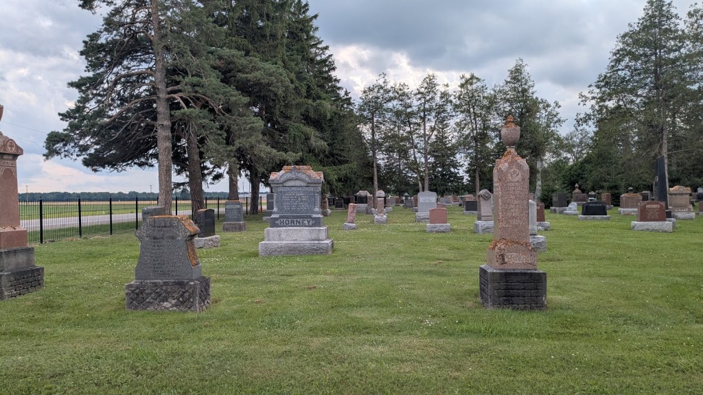 On the way home we called in at the Exeter (Ontario) Cemetery looking for a member of the Crich Family. As it’s quite a large cemetery compared to the country burial sites, and I couldn’t work out the plot numbers, I didn’t find the grave. I’ve since discovered that he’s in his wife’s family plot, the Rowcrofts, so if we go again I know what to look for.